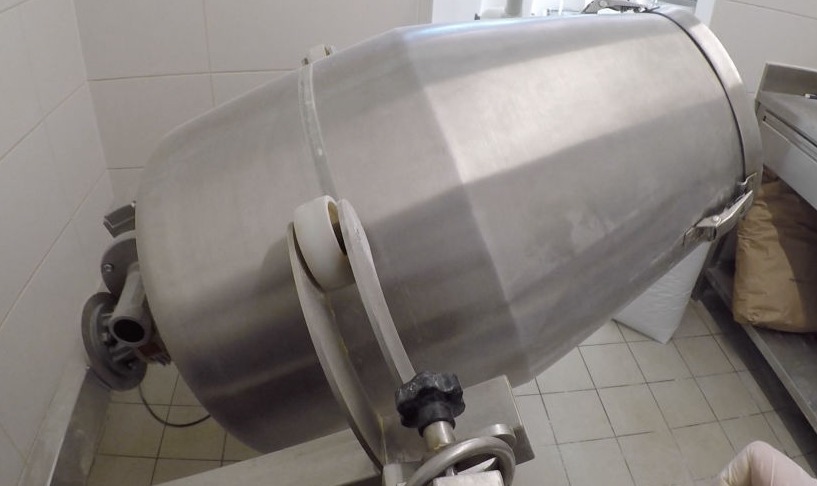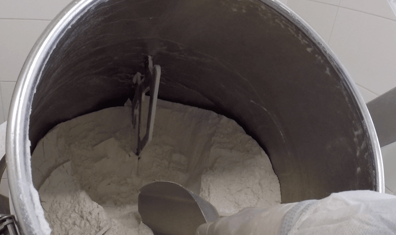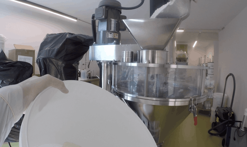 Nachdem die Substanzen abgewogen und dokumentiert wurden, werden sie alle zusammen in unsere große Mischtrommel gegeben.