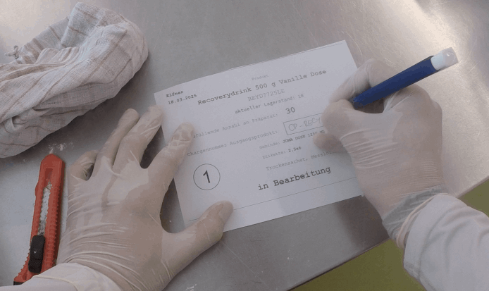 Abschließend werden die Anzahl an abgefüllten Produkten sowie die abgefüllte Charge notiert - so behalten wir immer einen Überblick.
