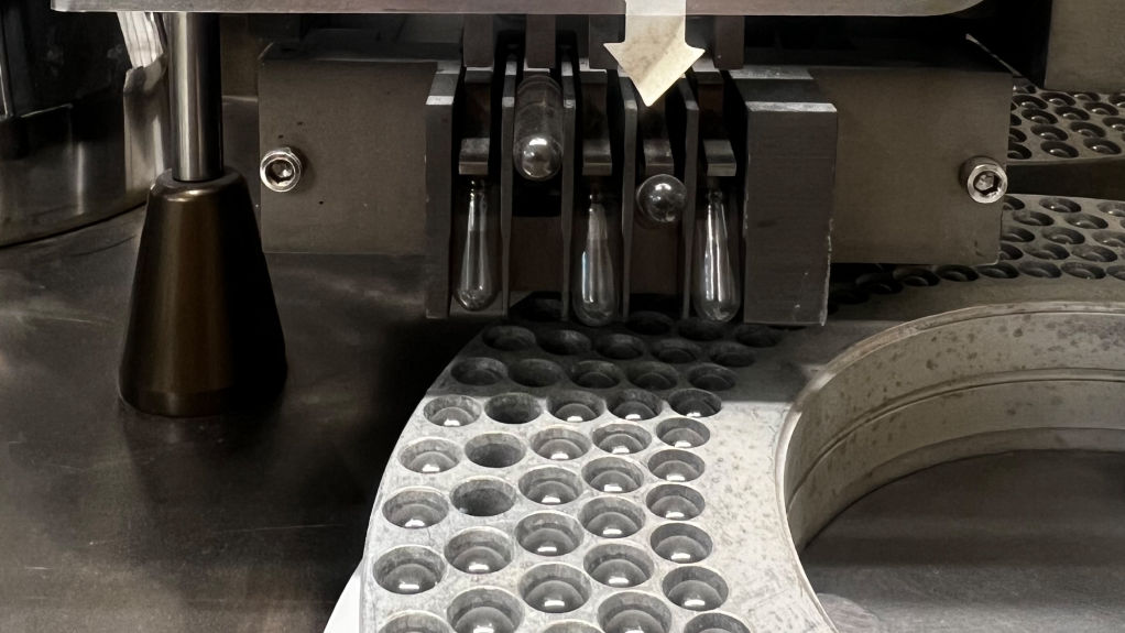 Das Abfüllen erfolgt nacheinander. Die Maschine kontrolliert über eine Waage die genaue Menge, die in jedes Gefäß gefüllt wird. So können wir ein konstantes Niveau gewährleisten. Mit Hilfe eines Fußpedals lässt sich die Abfüllung regeln.